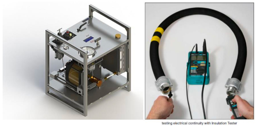 The test will involve subjecting a hose to pre-specified test pressure, during which there will be checks on the hoses to ascertain their integrity. Further, we will conduct an electrical continuity test to ascertain that the hoses can dissipate the required electrostatic charges during it’s usage and also check the electrical bond between the end fittings .